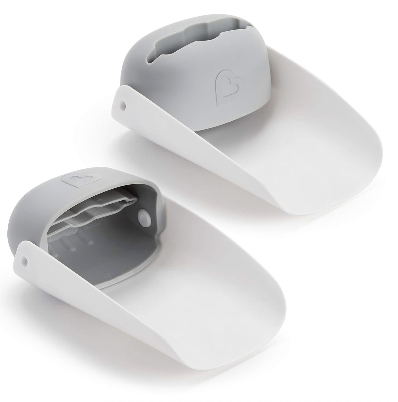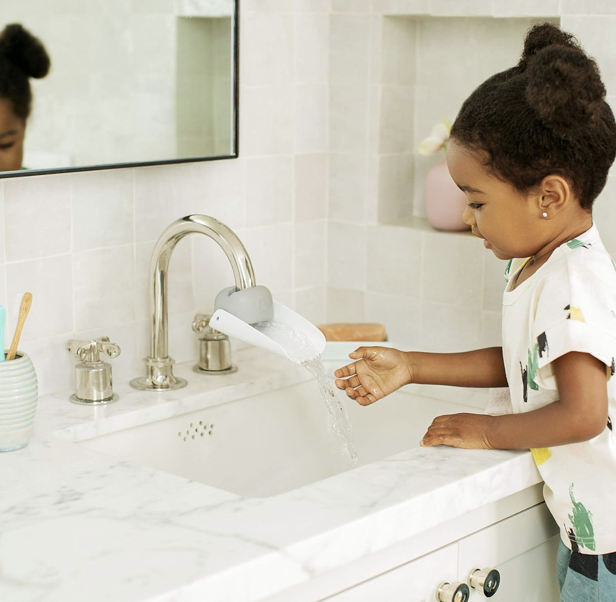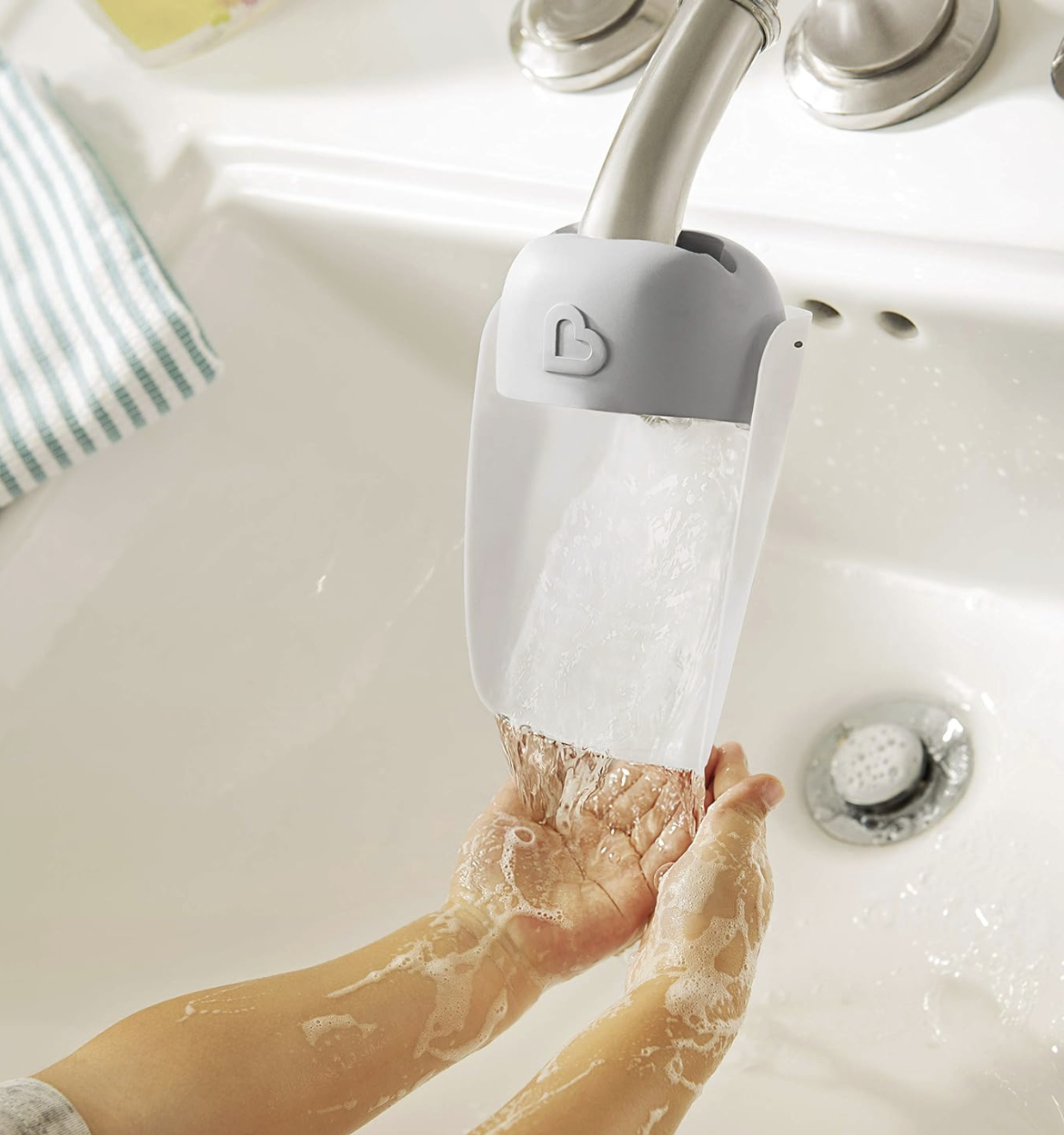 If installing a side-mounted faucet is not an option for you or is not yet needed, faucet extenders can be a great solution to more easily reach the water flowing from your sink faucet. Faucet extenders come in two main styles: swivel faucet extenders attach to the faucet by screwing onto the end. Most swivel-style faucets can be adjusted in multiple heights and positions. Low-tech faucet extenders are made of silicone and slide over the top of the faucet handle to create a funnel for the water. The funnel extends the angle at which the water comes out of the faucet, making it easier to reach.